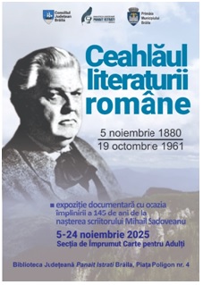Cu ocazia împlinirii a 145 de ani de la nașterea scriitorului Mihail Sadoveanu, Biblioteca Județeană Panait Istrati Brăila organizează expoziția documentară Ceahlăul literaturii române, care poate fi vizitată la parterul Compartimentului Împrumut Carte pentru Adulți în perioada 5-24 noiembrie a.c.