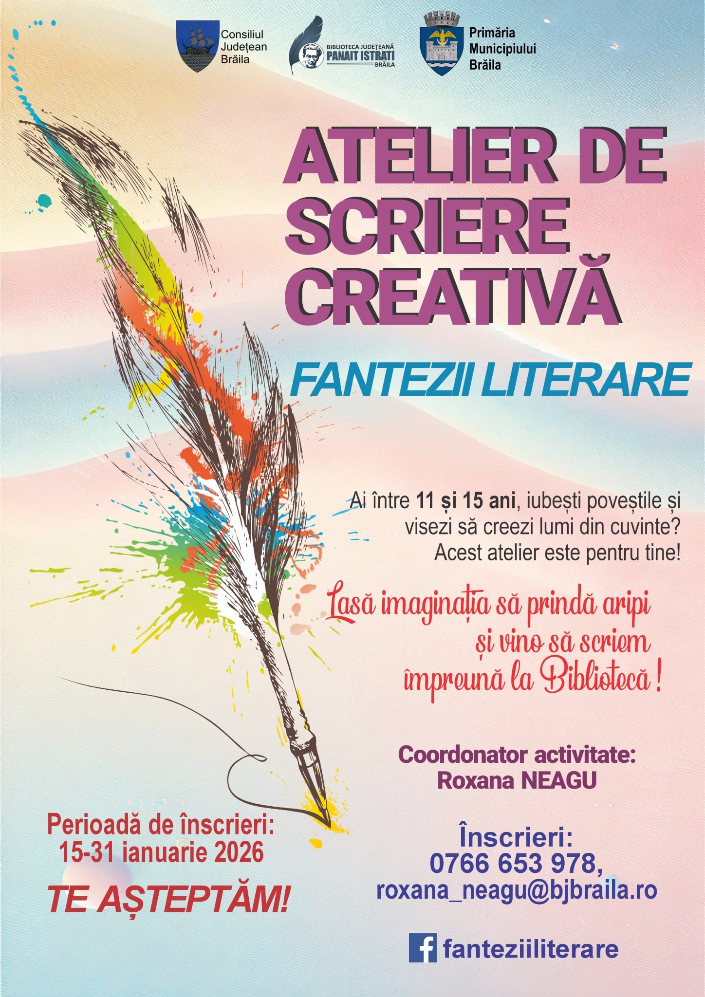 Biblioteca Județeană „Panait Istrati” Brăila anunță organizarea Atelierului de Scriere Creativă „Fantezii literare”, un program educațional dedicat copiilor și adolescenților cu vârste cuprinse între 11 și 15 ani, pasionați de scris și de explorarea creativității literare.