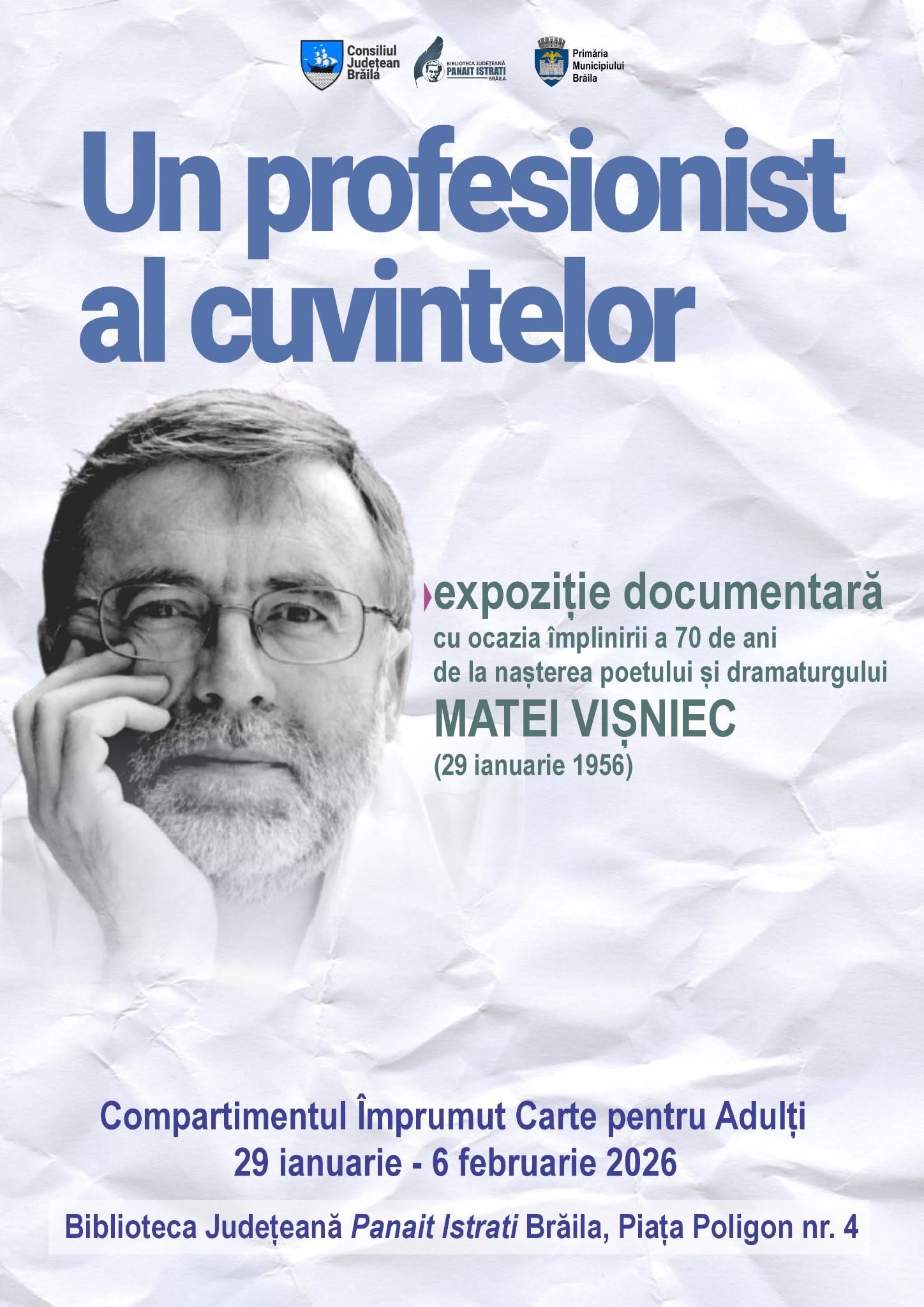 În perioada 29 ianuarie – 6 februarie 2026, Consiliul Județean Brăila, prin Biblioteca Județeană „Panait Istrati” Brăila , în colaborare cu Primăria Municipiului Brăila, organizează, la sediul bibliotecii judeenedin municipiul Brăila, Piața Poligon, nr. 4, expoziția documentară „ Un profesionist al cuvintelor”, dedicată poetului și dramaturgului Matei Vișniec, cu ocazia împlinirii a 70 de ani de la nașterea acestuia.