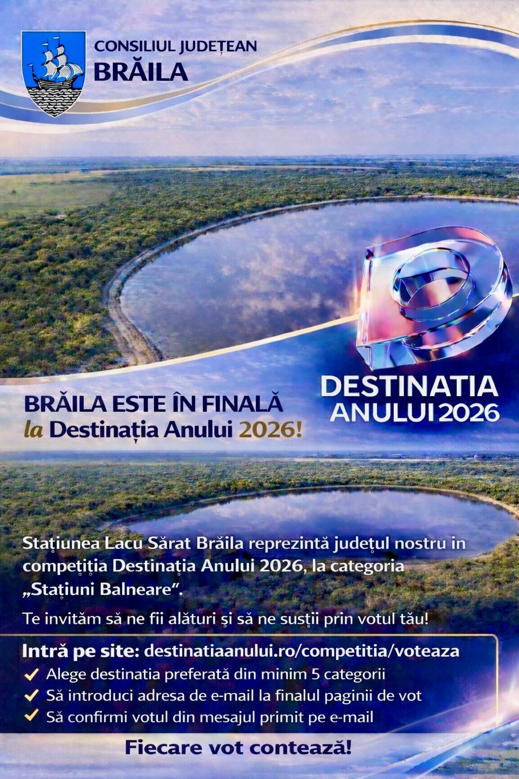 BRĂILA ESTE ÎN FINALĂ LA DESTINAȚIA ANULUI 2026! Stațiunea Lacu Sărat Brăila reprezintă județul nostru în competiția Destinația Anului 2026, la categoria „Stațiuni Balneare”. Te invităm să ne fii alături și să ne susții prin votul tău! Votează Lacu Sărat Brăila și ajută-ne să aducem această recunoaștere acasă. Important: după ce votezi la minim 5 categorii, pentru ca votul tău să fie valid, este necesar: să introduci adresa de e-mail la finalul paginii de vot; să confirmi votul din mesajul primit pe e-mail. Fiecare vot contează! Votează acum! Distribuie Facebook Twitter Google + LinkedIn Pinterest