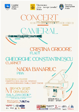 Miercuri, 19 noiembrie 2025, de la ora 18:00, Sala „Dan Dediu” va deveni un spațiu al întâlnirii dintre artiști, într-un concert cameral în care sonoritățile calde ale clarinetului se vor împleti cu transparența flautului și cu armoniile adânci ale pianului.